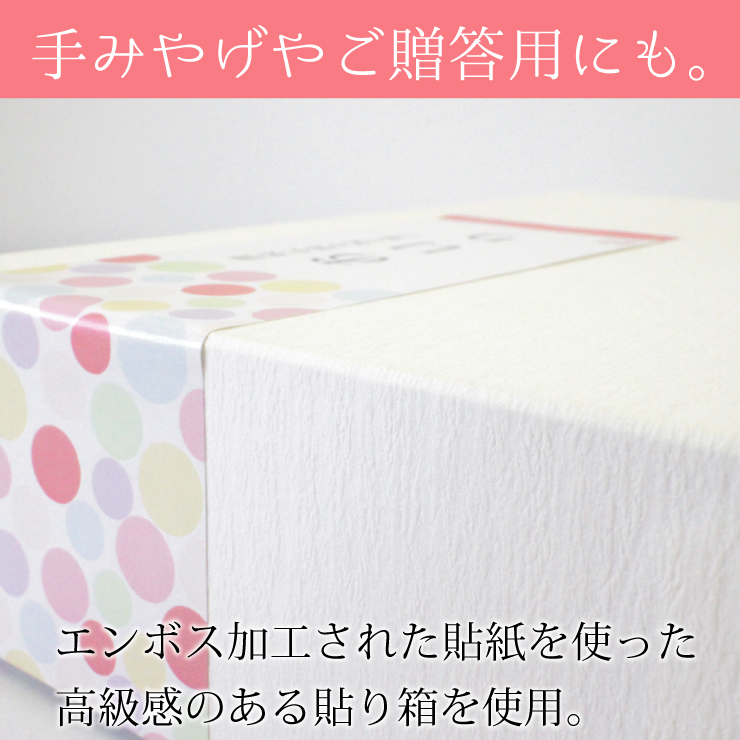 贈答用に贈答用に注文しました。1週間もかからず届きました。箱もおいりもかわいくて喜んで貰えました!