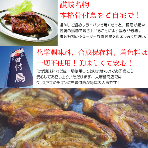 | 原材料 | 骨付鳥:若鶏もも(香川県産)、塩(瀬戸内海産)、胡椒、にんにくパウダー、無農薬とうがらし(三豊市産) 鳥油:国産鶏脂100% |