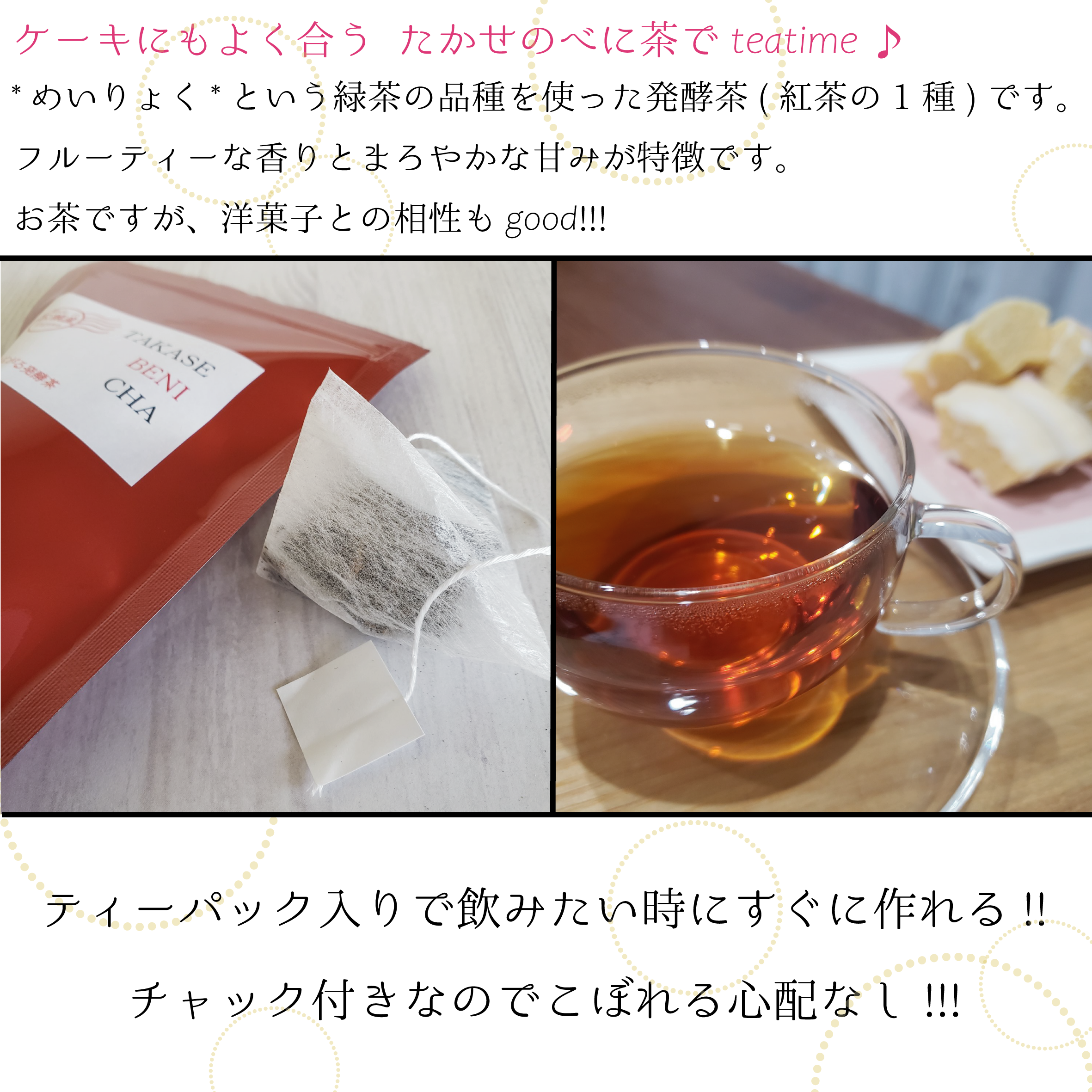 高瀬町の山間には、穏やかで広大な茶畑がいくつもあります。そこで育まれた、茶用品種の“めいりょく”で作った発酵茶です。ほんのりしたまろやかな甘味とフルーティーな芳香が特徴のお茶です。発酵茶なので、紅茶に近い味わいをしています。後味は少し日本茶の渋い旨みが残ります。ティーバックなので手間がかからず簡単♪飲みたい時にすぐ飲めるのもいいですね。あま〜いお茶菓子と一緒に、疲れた体を癒しませんか?内容量:30g(2g×15パック)