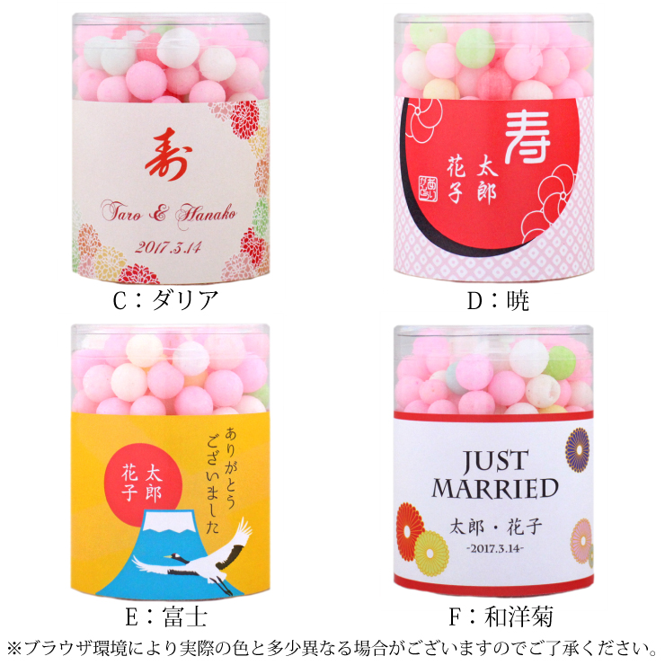 プチギフトにしました種類がいっぱいあって悩んだので、”暁”と”コインドット”の2種類で注文しました。どちらもかわいくて、ゲストの方にも喜んで貰えました♪