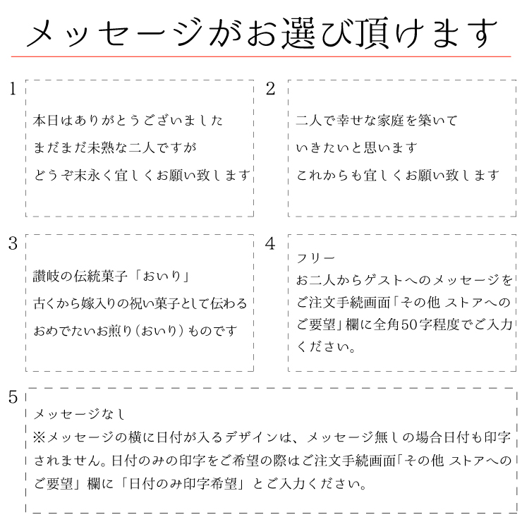 デザインで選びました色々なお店のおいりを見比べて、デザインが気に入りこちらで注文しました!今日商品が届いて実物を見て、大満足です!結婚式当日が楽しみですヽ(´▽`)/